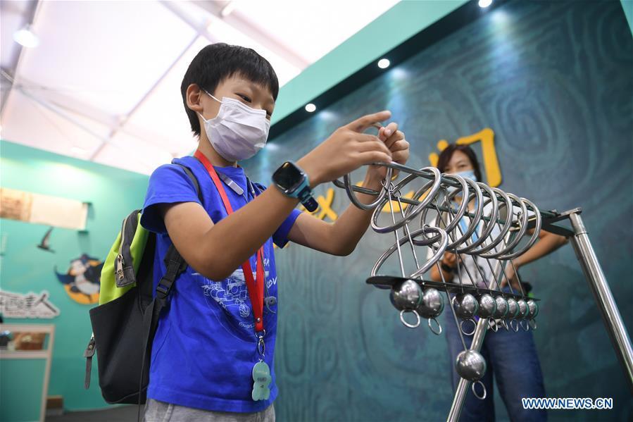 A boy tries the toy of Chinese ring puzzle at the Beijing-Tianjin-Hebei culture collaborative development exhibition area in Cultural Services Exhibition of the 2020 China International Fair for Trade in Services (CIFTIS) in Beijing, capital of China, Sept. 7, 2020. The CIFTIS runs on Sept. 4-9 in Beijing. (Xinhua/Lu Peng)