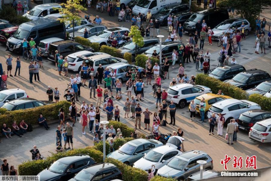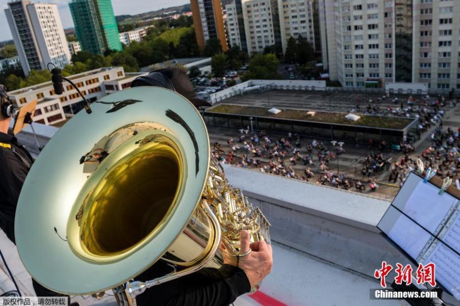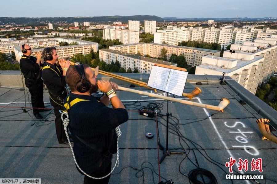 16 alphorns, 9 trumpets and 4 tubas were placed on rooftops in the German city of Dresden for an socially distant performance. The Dresdner Sinfoniker orchestra set its percussion instruments at a parking lot as people watched from their balconies.