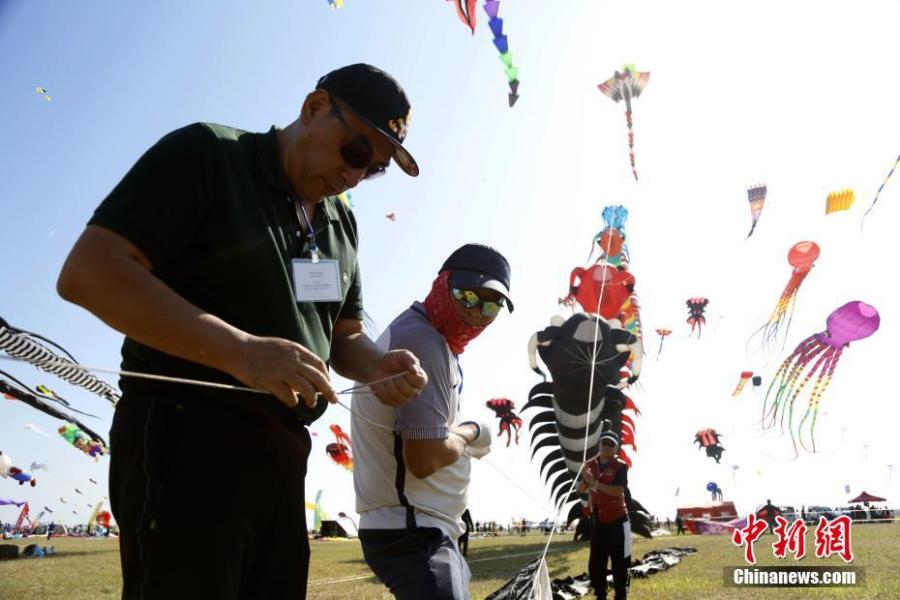 Kite enthusiasts fly their kites at the opening ceremony of the 37th Weifang International Kite Festival in Weifang, East China's Shandong province, September 26, 2020. (Photo: China News service/Sha Jianlong)