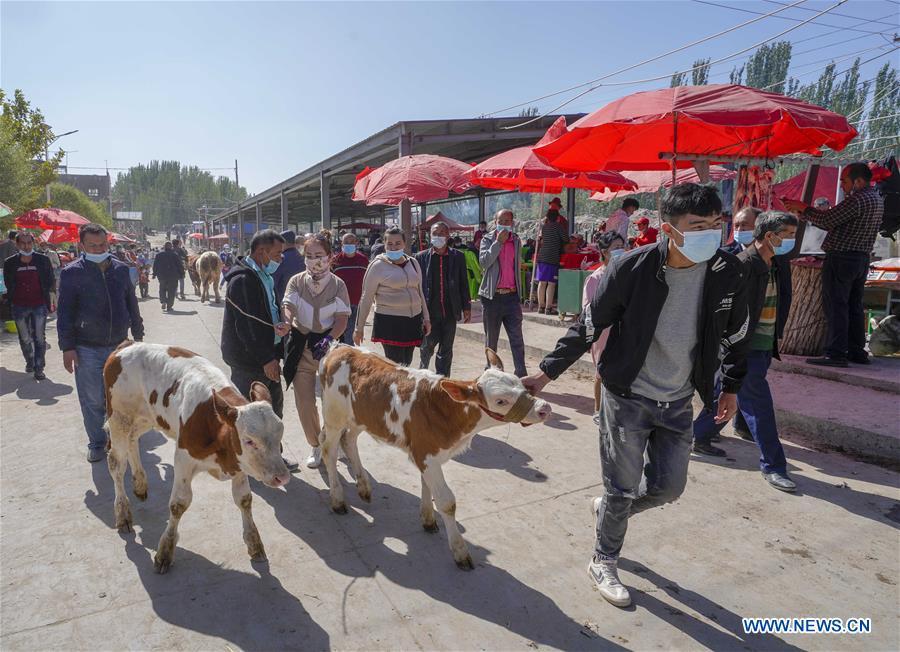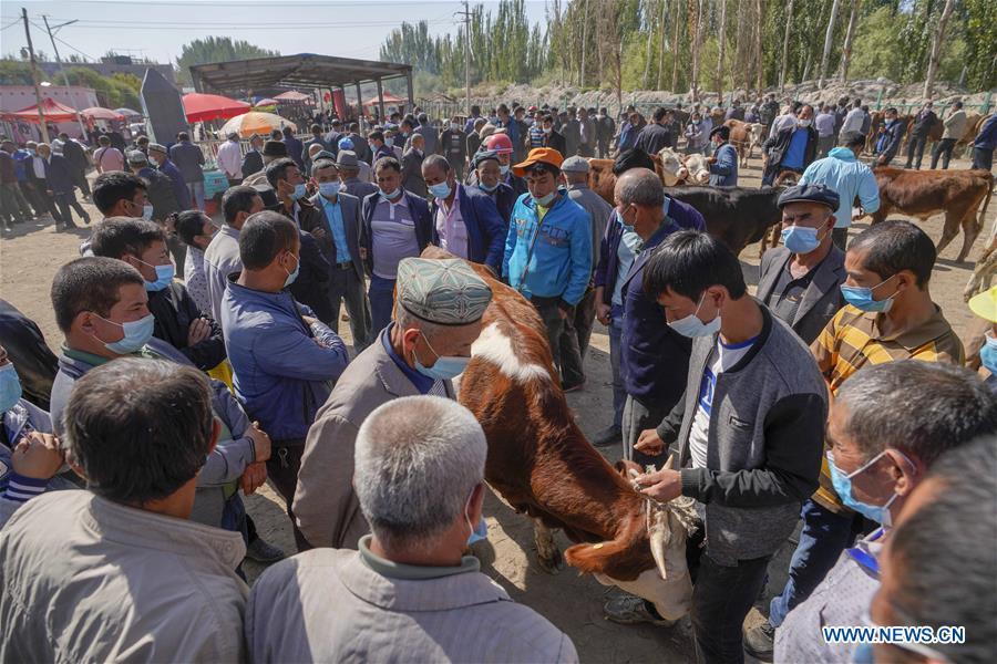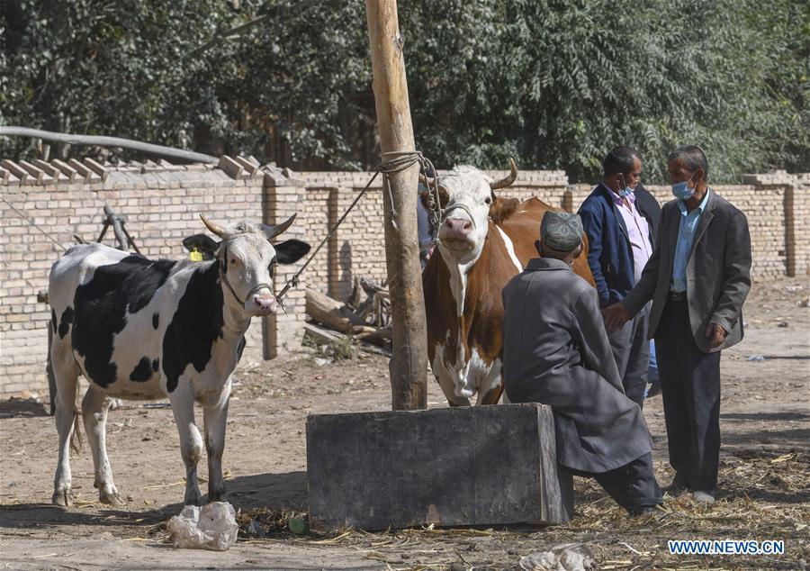 Villagers purchase cattle at a bazaar in a town of Shufu County, northwest China's Xinjiang Uygur Autonomous Region, Sept. 21, 2020. A cattle and sheep bazaar is held at the town in Shufu. (Xinhua/Zhao Ge)