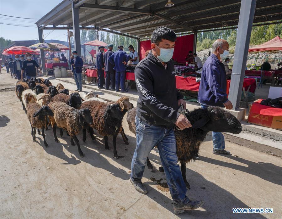 A villager leads a herd of sheep to a bazaar in a town of Shufu County, northwest China's Xinjiang Uygur Autonomous Region, Sept. 21, 2020. A cattle and sheep bazaar is held at the town in Shufu. (Xinhua/Zhao Ge)