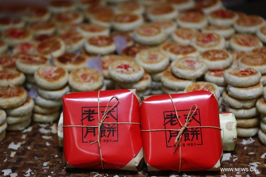 Photo taken on Sept. 29, 2017 shows Anhui style mooncakes in Xiuning County of Huangshan, east China's Anhui Province. The 68-year-old Cheng Guisheng has learned making a kind of special mooncakes with traditional Anhui characteristics when he was young. The stuffing of the mooncakes is mixed pickled edible wild herbs with lard oil and sugar. This kind of mooncakes are traditional cakes for people in the ancient Huizhou area when Mid-autumn Festival is coming around. (Xinhua/Shi Yalei)