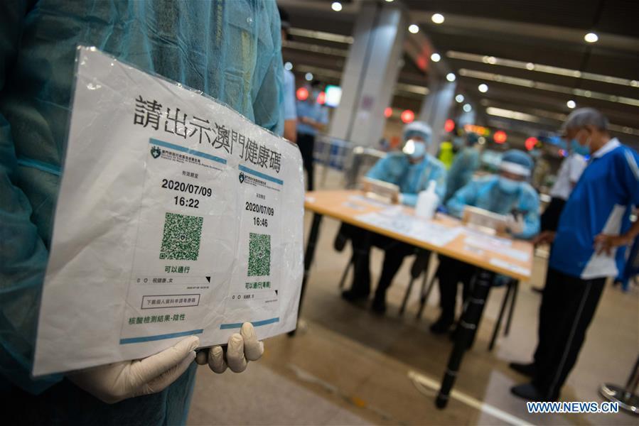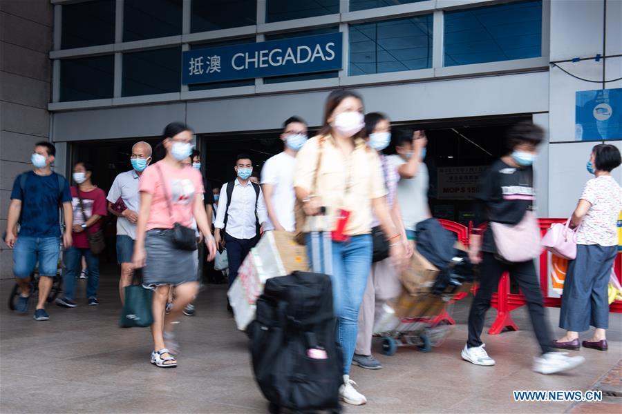 People are seen at an entry port of Macao in south China, Sept. 29, 2020. Government departments of China's Macao Special Administrative Region (SAR) are ready to embrace tourists during the country's National Day holiday, with a series of measures in place to ensure order and pandemic prevention, said local authorities Tuesday. (Xinhua/Cheong Kam Ka)