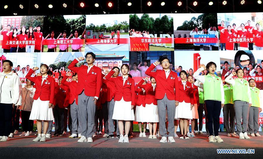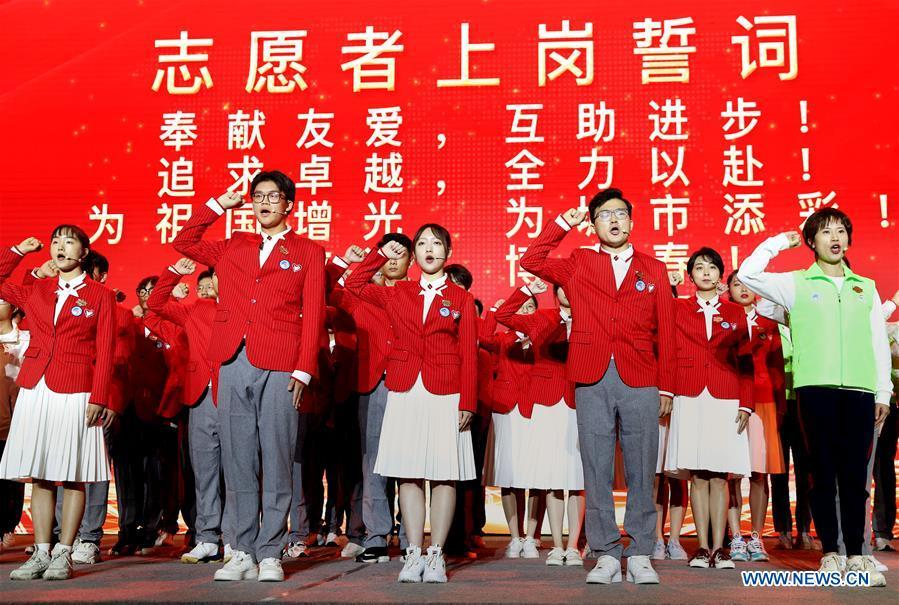 Volunteers of the third China International Import Expo (CIIE) attend an oath-taking ceremony at the National Exhibition and Convention Center in Shanghai, east China, Oct. 18, 2020. Over 4,800 people were sworn in as volunteers and went on duty on Sunday for the upcoming third China International Import Expo (CIIE). (Xinhua/Liu Ying)