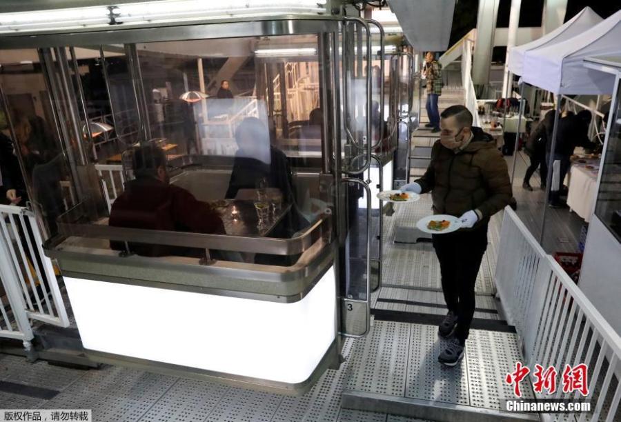 A waiter serves customers as Michelin-starred restaurant Costes moves into the Budapest Eye ferris wheel during the outbreak of the coronavirus disease in Budapest, Hungary, Oct. 17, 2020. (Photo/China News Service)