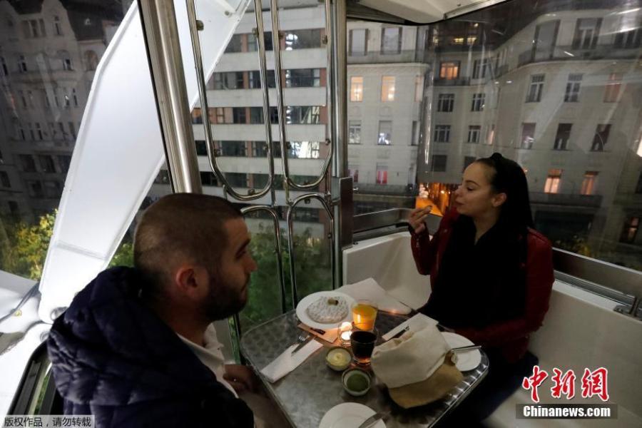 People enjoy their food as Michelin-starred restaurant Costes moves into the Budapest Eye ferris wheel during the outbreak of the coronavirus disease (COVID-19), in Budapest, Hungary, Oct. 17, 2020, in Budapest, Hungary. (Photo/China News Service)