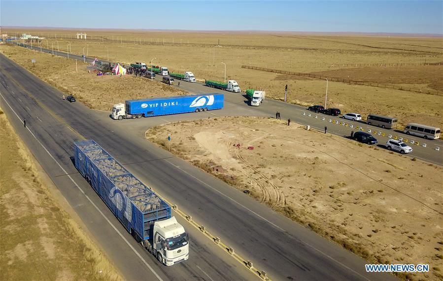 Photo taken on Oct. 22, 2020 shows trucks loaded with sheep donated by Mongolia passing Erenhot Port in Erenhot, north China's Inner Mongolia Autonomous Region. Over a dozen trucks loaded with 4,000 sheep from Mongolia arrived in the China-Mongolia border city of Erenhot, Inner Mongolia Autonomous Region, on Thursday. This was the first batch of 30,000 sheep donated by Mongolia in support of China's COVID-19 epidemic fight. According to a bilateral agreement, the sheep are transported to Erenhot in batches, where they are slaughtered and processed before being sent to central China's Hubei Province, the former frontier of China's epidemic fight. (Xinhua/Peng Yuan)