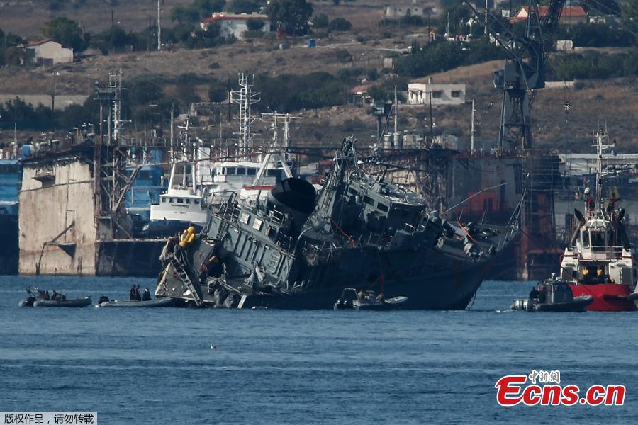 The damaged Hellenic Navy minehunter HS Kallisto is towed after its collision with a container ship off the port of Piraeus, near Perama, Greece, October 27, 2020. (Photo/Agencies)