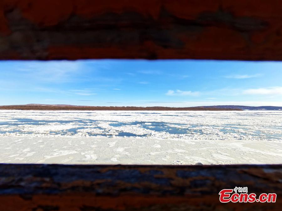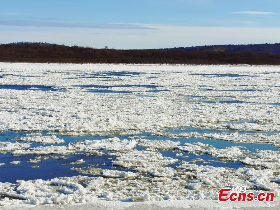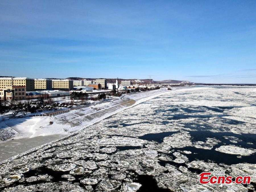 Photo taken on Nov. 3, 2020 shows ice floating on the Huma section of the Heilongjiang River in northeast China's Heilongjiang Province, marking that Heilongjiang is about to enter frozen season. (Photo/VCG)