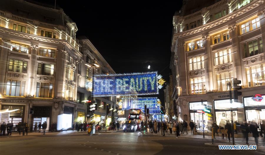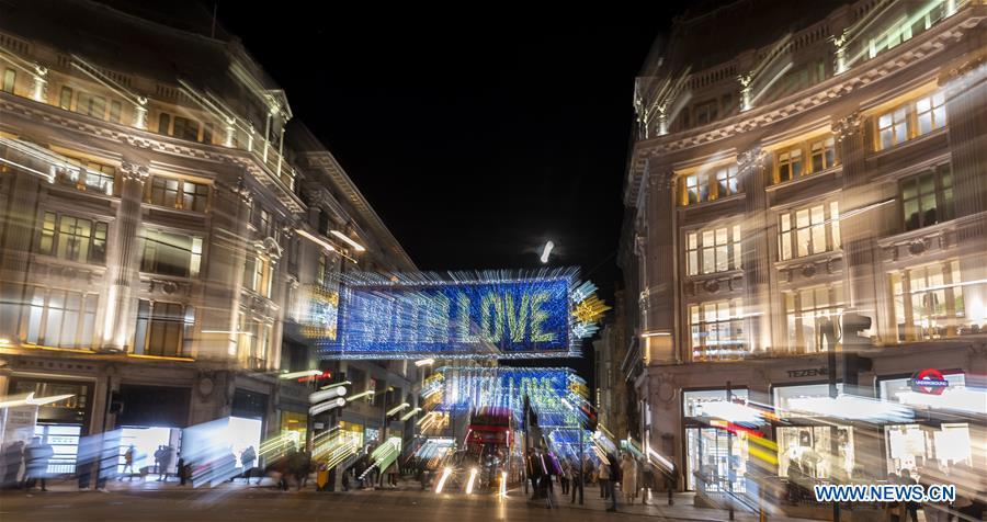 Photo taken on Nov. 3, 2020 shows the Christmas lights illuminating the main shopping Oxford Street, in London, Britain. Oxford Street Christmas lights were switched on from Monday. The lights pay tribute to the strength and brilliance of Londoners and also honor those who've demonstrated kindness and steadfast support to others during the pandemic. (Xinhua/Han Yan)