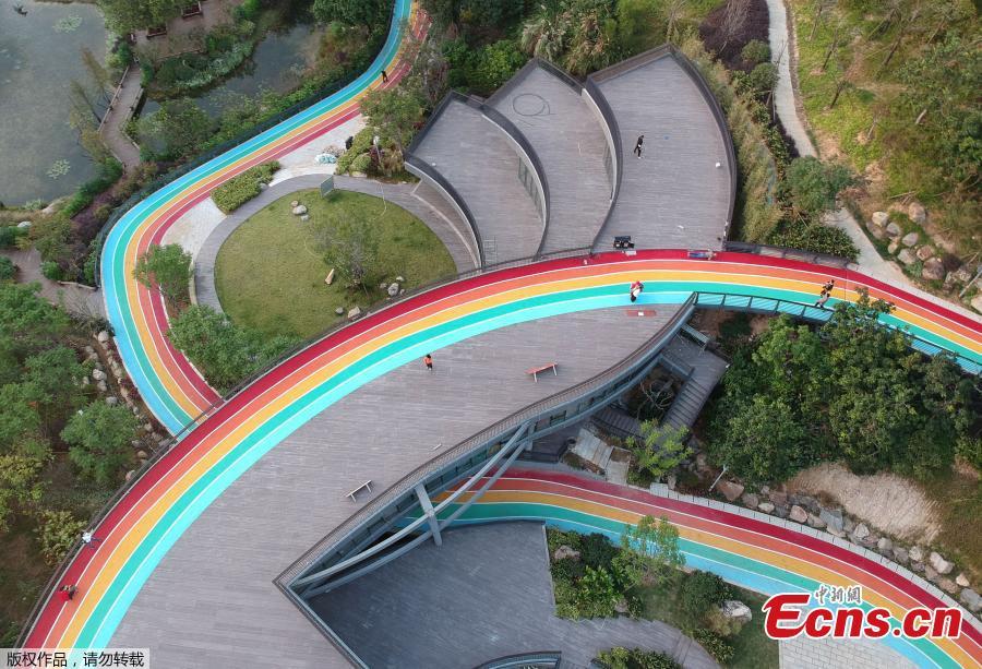 People walk on the rainbow footpath in Fuzhou, east China's Fujian Province, on November 9, 2020. A rainbow footpath has been built in a forest in Fuzhou, for local residents to spend their leisure time. (Photo: China News Service/Lu Ming)