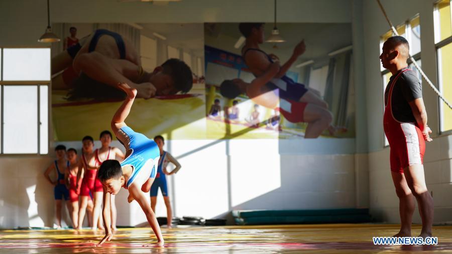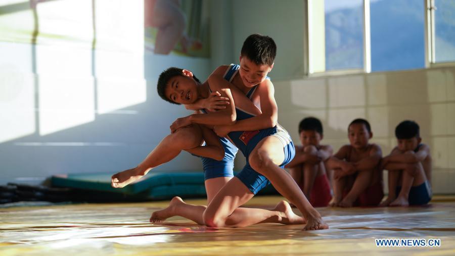 Photo taken on Nov. 11, 2020 shows students practising wrestling at the stadium of Matian School in Pingxiang, east China's Jiangxi Province. The Matian School in Wugong Mountain in the city of Pingxiang in east China's Jiangxi Province is a rural school with a strong wrestling program. 42-year-old Zhu Zhihui is the principal of the school. In his 14 years of teaching, Zhu has trained hundreds of wrestlers. Stressing the importance of sports and exercises in education, the former weightlifter always believes that "when kids are healthy physically and mentally, they are halfway towards success." (Xinhua/Hu Chenhuan)