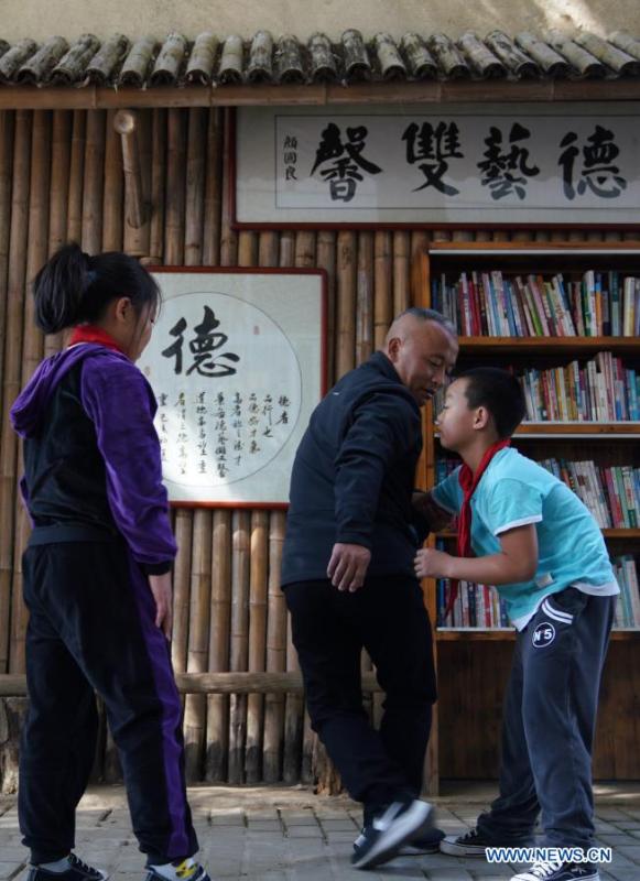 Photo taken on Nov. 11, 2020 shows Zhu Zhihui (R) and students of Matian School taking part in a training session in Pingxiang, east China's Jiangxi Province. The Matian School in Wugong Mountain in the city of Pingxiang in east China's Jiangxi Province is a rural school with a strong wrestling program. 42-year-old Zhu Zhihui is the principal of the school. In his 14 years of teaching, Zhu has trained hundreds of wrestlers. Stressing the importance of sports and exercises in education, the former weightlifter always believes that "when kids are healthy physically and mentally, they are halfway towards success." (Xinhua/Hu Chenhuan)