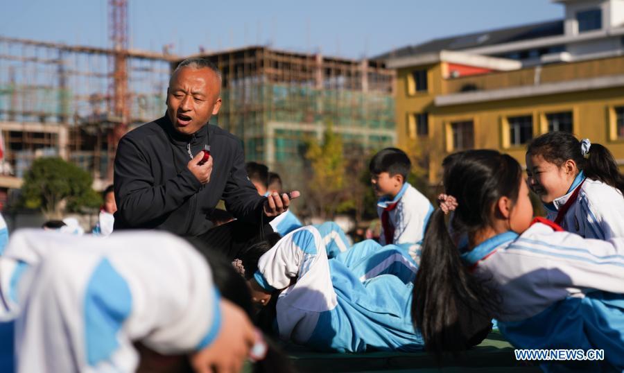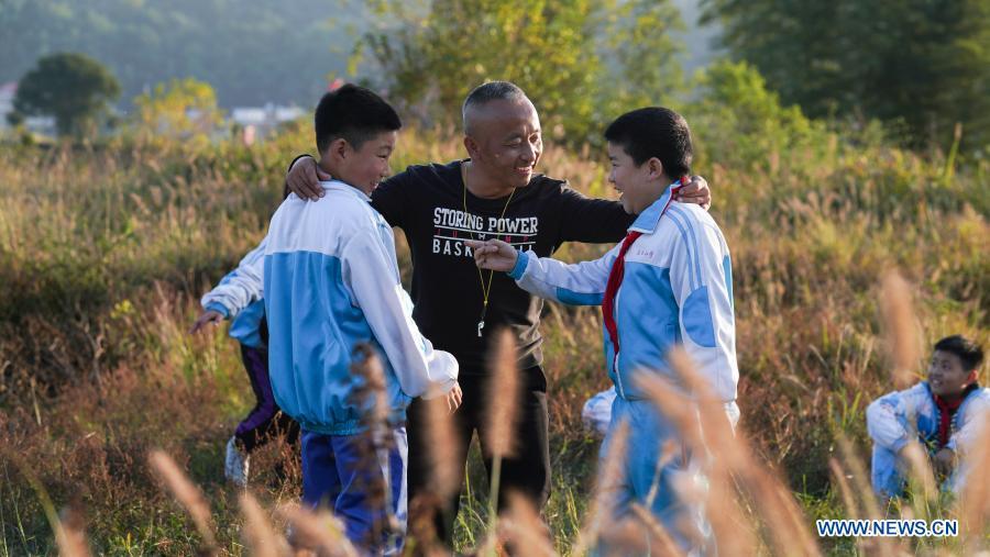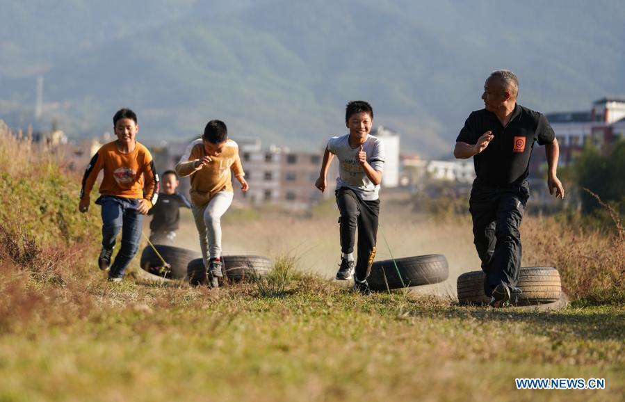 Photo taken on Nov. 10, 2020 shows Zhu Zhihui (1st R, front) and students of Matian School jumping rope in Pingxiang, east China's Jiangxi Province. The Matian School in Wugong Mountain in the city of Pingxiang in east China's Jiangxi Province is a rural school with a strong wrestling program. 42-year-old Zhu Zhihui is the principal of the school. In his 14 years of teaching, Zhu has trained hundreds of wrestlers. Stressing the importance of sports and exercises in education, the former weightlifter always believes that "when kids are healthy physically and mentally, they are halfway towards success." (Xinhua/Hu Chenhuan)