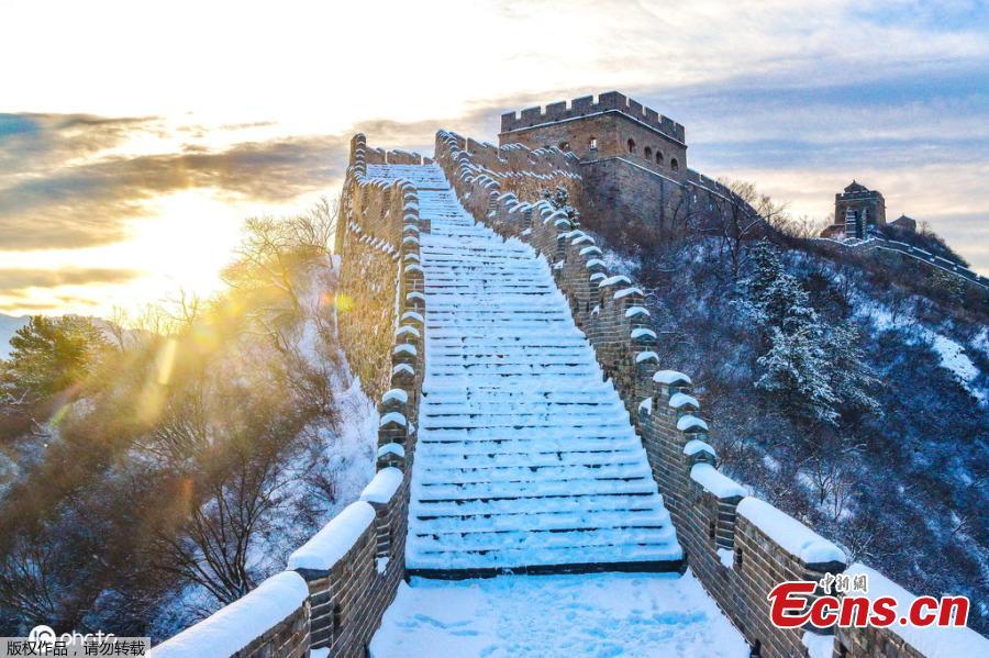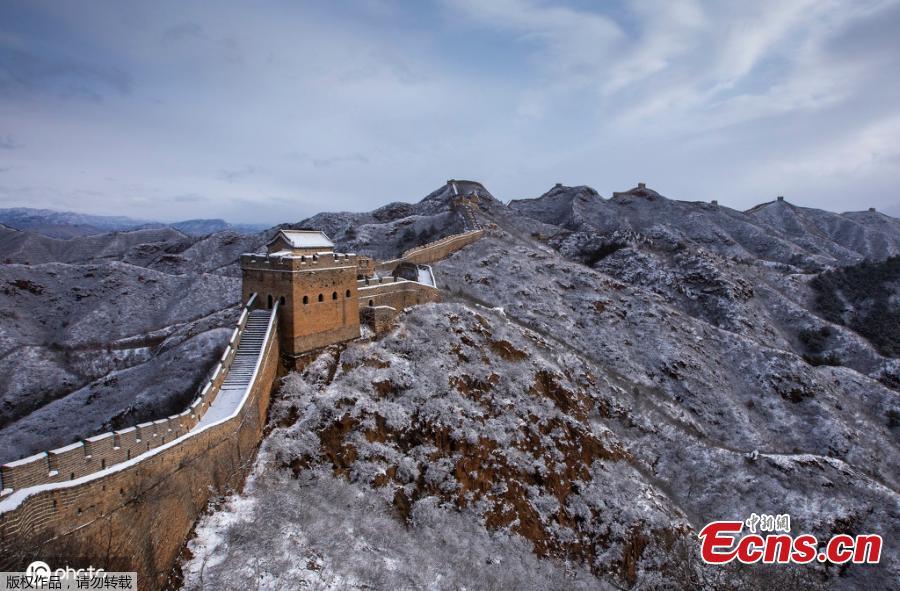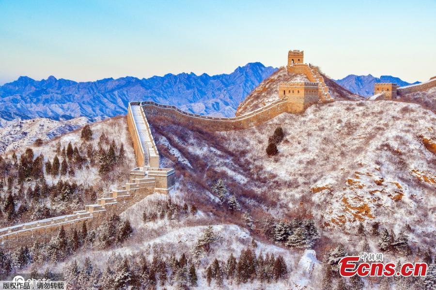 Photo taken on Nov. 19, 2020, shows Jinshanling Great Wall in Hebei Province, north China, covered in a crisp white blanket after snow. Jinshanling is the best preserved section of the Great Wall, with many original features. The earliest part of the wall was built in 1368, during the Ming Dynasty. (Photo/IC)