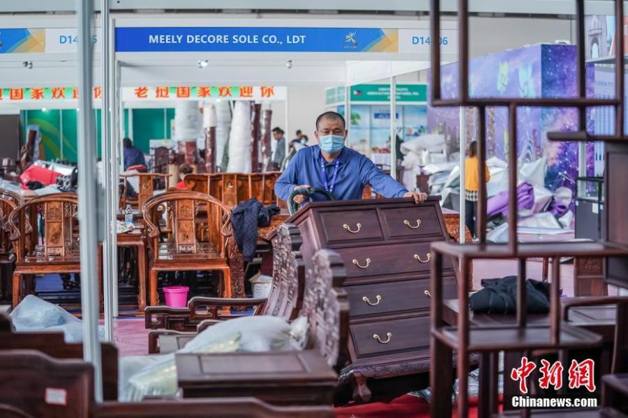 A staff member arranges exhibits at the upcoming 17th China-ASEAN Expo in Nanning, South China's Guangxi Zhuang Autonomous Region, Nov. 25, 2020. (Photo: China News Service/ Yu Jing)