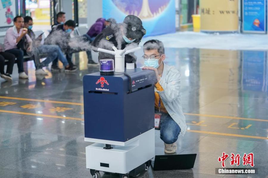 A staff member debugs a robot at the upcoming 17th China-ASEAN Expo in Nanning, South China's Guangxi Zhuang Autonomous Region, Nov. 25, 2020. (Photo: China News Service/ Yu Jing)