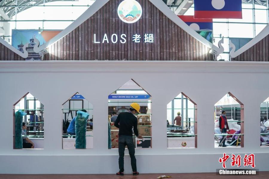 A staff member works in the exhibition area of Laos at the upcoming 17th China-ASEAN Expo in Nanning, South China's Guangxi Zhuang Autonomous Region, Nov. 25, 2020. (Photo: China News Service/ Yu Jing)