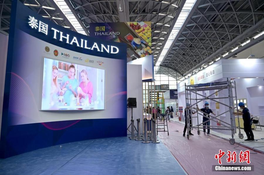 Staff members work in the exhibition area of Thailand at the upcoming 17th China-ASEAN Expo in Nanning, South China's Guangxi Zhuang Autonomous Region, Nov. 25, 2020. (Photo: China News Service/ Yu Jing)