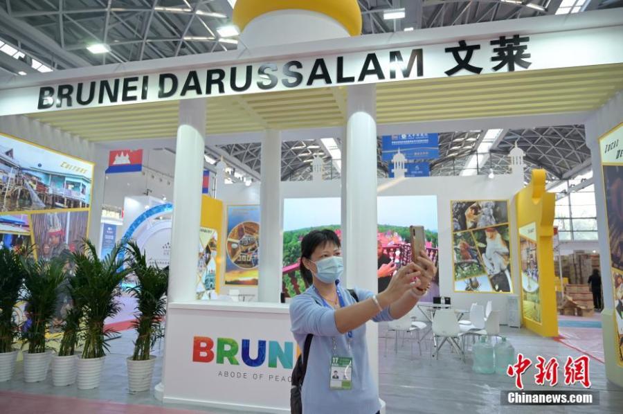 An exhibitor takes a selfie in front of the exhibition area of Brunei at the upcoming 17th China-ASEAN Expo in Nanning, South China's Guangxi Zhuang Autonomous Region, Nov. 25, 2020. (Photo: China News Service/ Yu Jing)