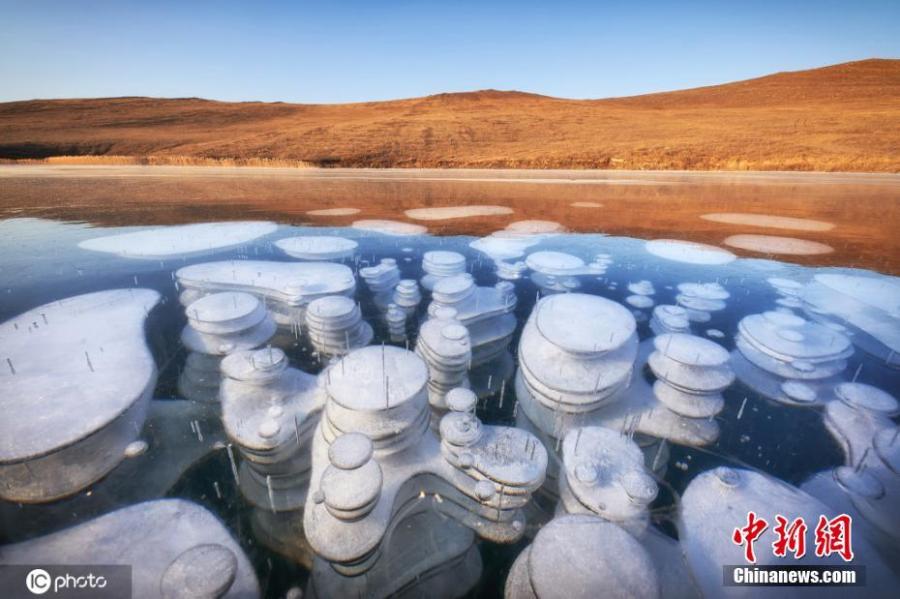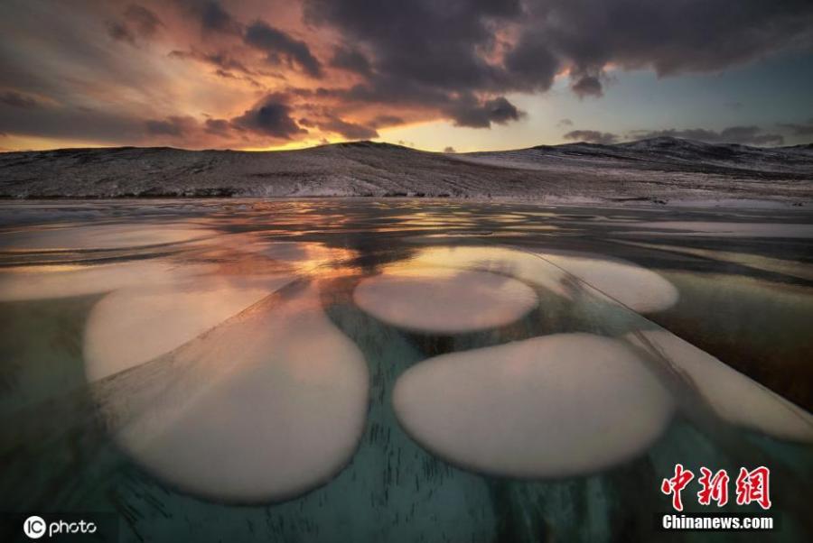 Bubbles of frozen methane are seen through crystal clear ice of lake Baikal, Nov. 25, 2020. 'Methane bubbles freeze in layers one over the other, and the floors of them can grow 1.5 metres deep, creatinig a bizarre, beautiful sight. (Photo/ICphoto)