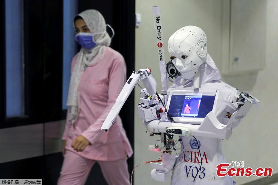 Cira 3, a remote-controlled robot that runs tests on suspected coronavirus disease (COVID-19) patients to limit the human exposure to the virus is seen next to a healthcare worker in a corridor of the hospital, amid a second wave of infections in Tanta, Egypt, November 18, 2020. (Photo/Agencies)