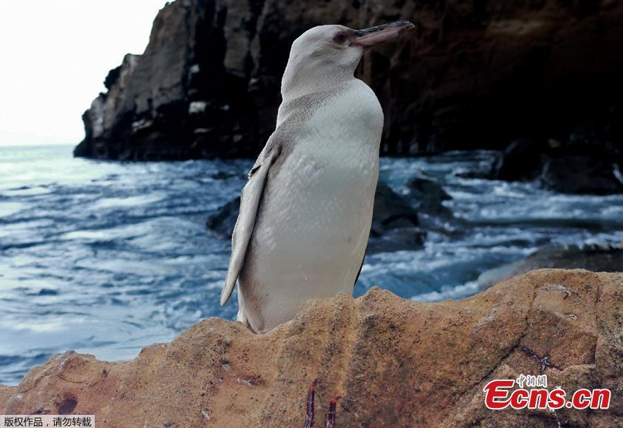 Handout photo taken on Nov. 19, 2020 and released by the Galapagos National Park shows a rare White Galapagos Penguin (Spheniscus mendiculos) discovered in Punta Vicente Roca, north of Isabela island, Galapagos, Ecuador.(Photo/Agencies)