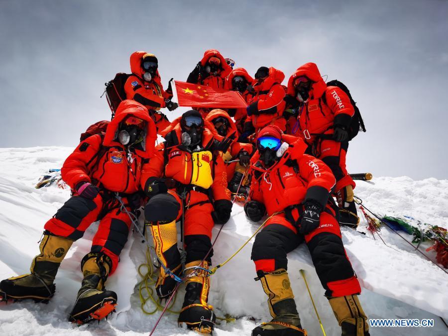 Chinese surveyors pose for a group photo atop Mount Qomolangma on May 27, 2020. The new height of Mount Qomolangma, the world's highest peak, is 8,848.86 meters, China and Nepal jointly announced on Tuesday. (Xinhua/Tashi Tsering)