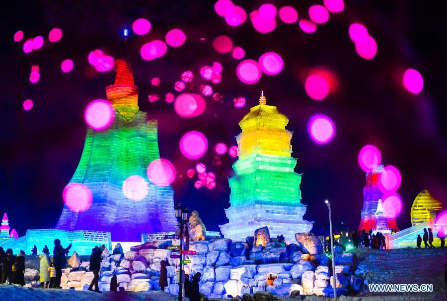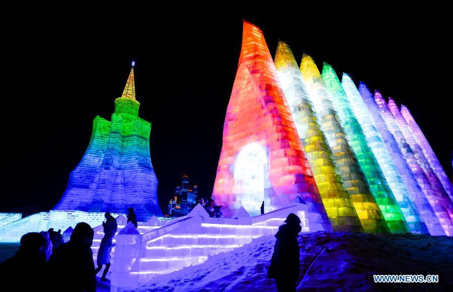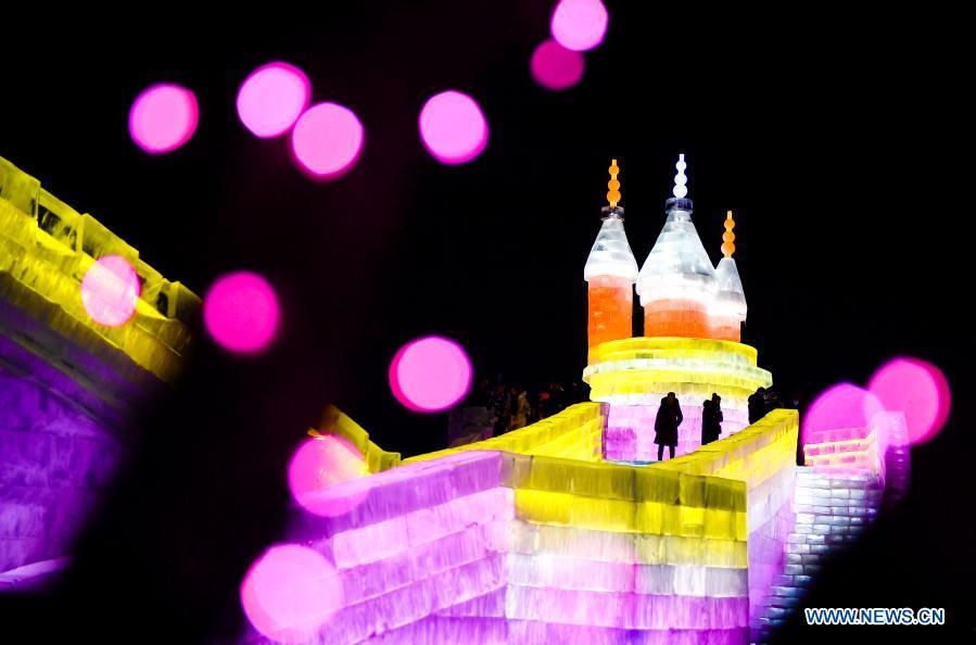 Tourists visit an ice-snow theme park in Changchun, northeast China's Jilin Province, Dec. 12, 2020. The ice-snow theme park with 142 ice buildings and snow sculptures officially opened to the public on Saturday. (Xinhua/Xu Chang)
