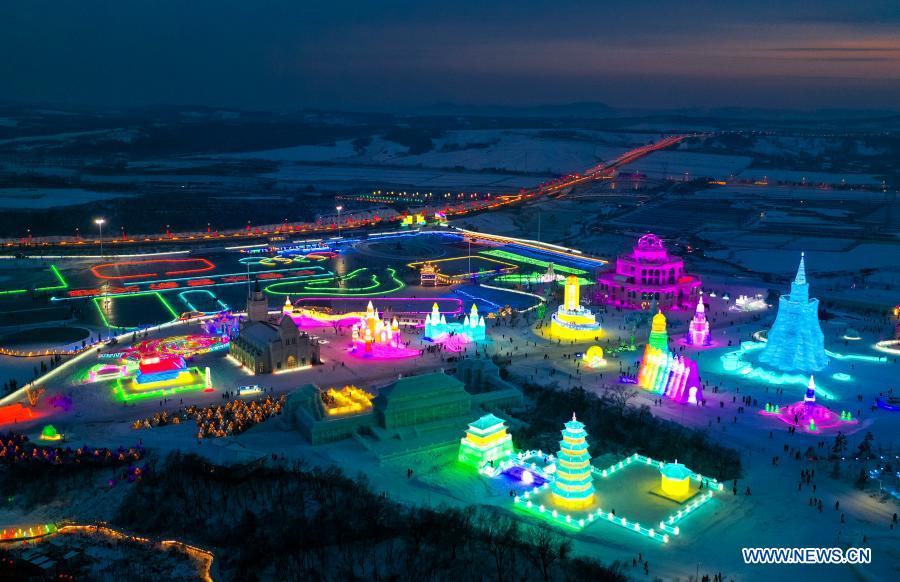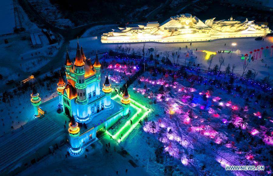Aerial photo shows an ice-snow theme park in Changchun, northeast China's Jilin Province, Dec. 12, 2020. The ice-snow theme park with 142 ice buildings and snow sculptures officially opened to the public on Saturday. (Xinhua/Xu Chang)
