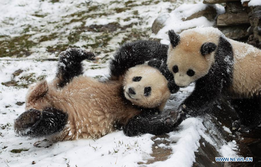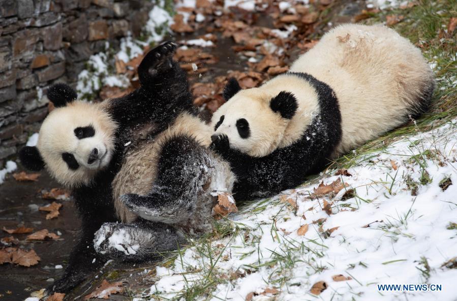 Giant pandas play after snow at Shenshuping base of China Conservation and Research Center for the Giant Panda in Wolong National Nature Reserve, southwest China's Sichuan Province, Dec. 17, 2020. (Xinhua/Jiang Hongjing)