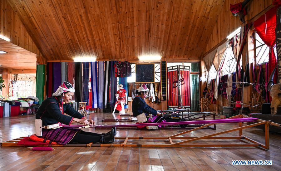 Villagers make hand-woven brocade at the Ximeng Impression, a local ethnic cultural company, in Yangluo Village of Wa Autonomous County of Ximeng, southwest China's Yunnan Province, Dec. 20, 2020. In recent years, the local government of Wa Autonomous County of Ximeng has been enhancing the protection of local intangible cultural heritage and helping people of Wa ethnic group preserve and inherit their ancient cultures and traditions. Cultural companies including Ximeng Impression in Yangluo Village are also participating in the efforts. They provide the locals with opportunities of learning weaving techniques and selling products of a great variety of hand-woven clothing. (Xinhua/Wang Guansen)
