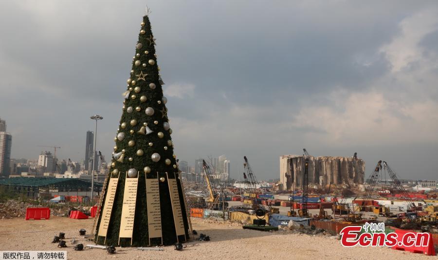 A Christmas tree with names of those who died during Beirut port explosion, is seen near the damaged grain silo, in Beirut, Lebanon December 22, 2020. (Photo/Agencies)