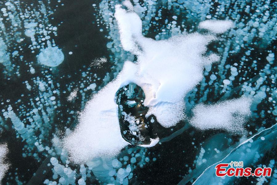 Frozen ice bubbles are seen in a river in Baishan City, Jilin Provicne, Dec. 22, 2020. The phenomenon is caused by dead organic matters. (Photo/VCG)