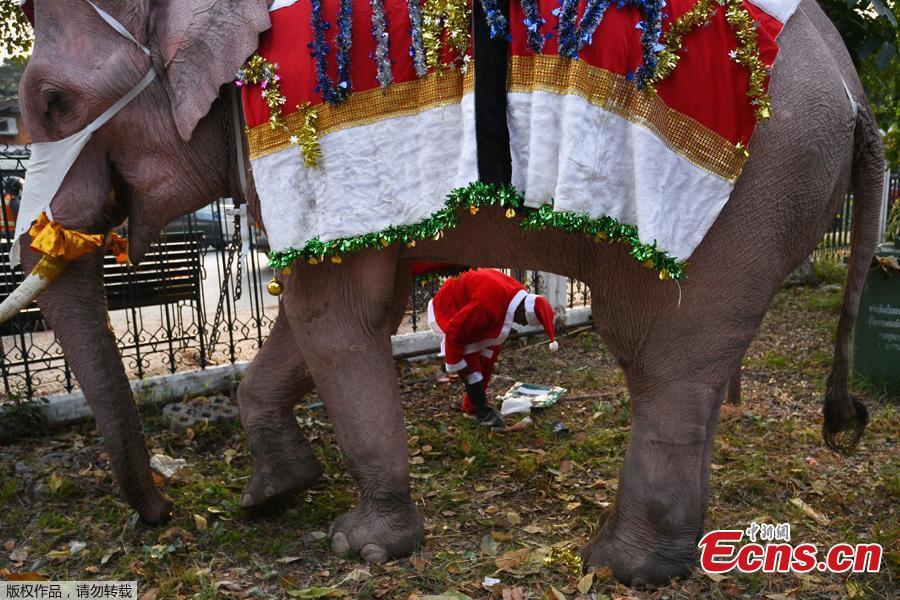 A mahout dresses an elephant as Santa Claus to help distribute face masks to students, in an effort to help prevent the spread of the coronavirus disease (COVID-19), ahead of Christmas celebrations at a school in Ayutthaya, Thailand, December 23, 2020. (Photo/Agencies)