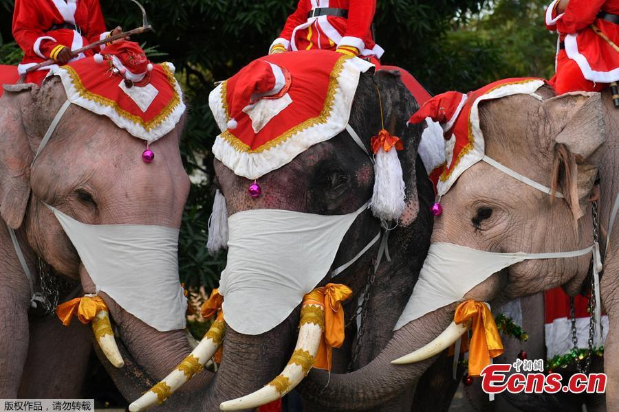 Mahouts dress elephants as Santa Claus to help distribute face masks to students, in an effort to help prevent the spread of the coronavirus disease (COVID-19), ahead of Christmas celebrations at a school in Ayutthaya, Thailand, December 23, 2020. (Photo/Agencies)