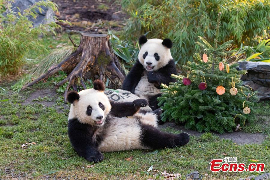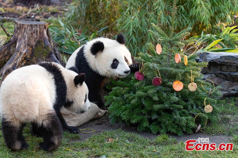 Photo taken on Dec. 18, 2020 shows twin pandas Meng Xiang und Meng Yuan play around a Chiristmas tree at Berlin Zoo, Germany. The zoo has prepared a Christmas tree decorated with fruit for the panda family on the Christmas Eve. (Photo provided to China News Service)