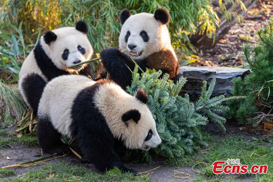 Photo taken on Dec. 18, 2020 shows the panda family members Meng Meng (the mother, Back, right) and her children Meng Xiang (Front) und Meng Yuan play around a Chiristmas tree at Berlin Zoo, Germany. The zoo has prepared a Christmas tree decorated with fruit for the panda family on the Christmas Eve. (Photo provided to China News Service)