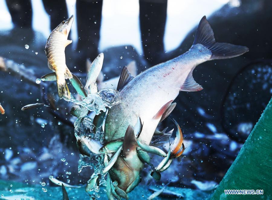 Photo shows fishes caught by fishermen during winter fishing on frozen Ulunggur Lake in Fuhai County, northwest China's Xinjiang Uygur Autonomous Region, Dec. 27, 2020. Every year, fishermen here follow the traditional winter fishing method by putting down a giant net under the ice for fishing on the frozon Ulunggur Lake, one of China's ten largest freshwater lakes. (Xinhua/Sadat)