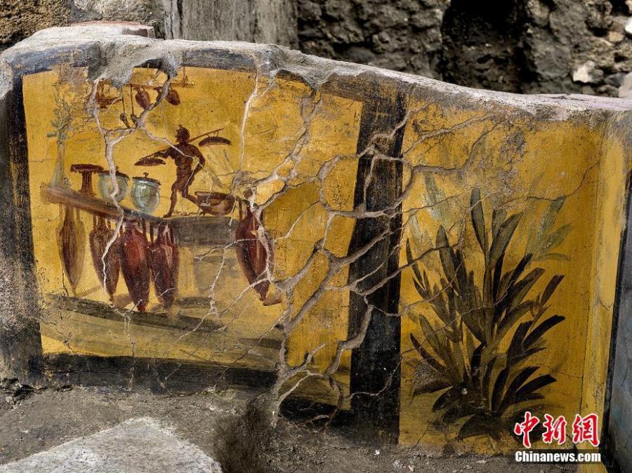 A fresco is seen on an ancient counter uncovered during excavations in Pompeii, Italy, Dec. 26, 2020. A "fast food" shop from the ancient Roman city of Pompeii, which was destroyed in a volcanic eruption almost 2,000 years ago, is to open to the public next year. The food counter, known as a thermopolium, would have served hot food and drinks to locals in the city. (Photo/IC photo)
