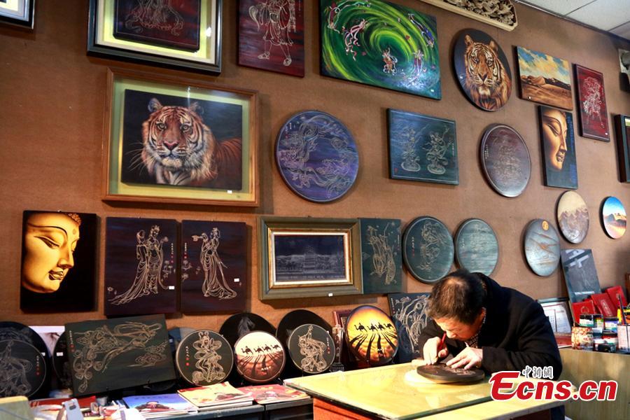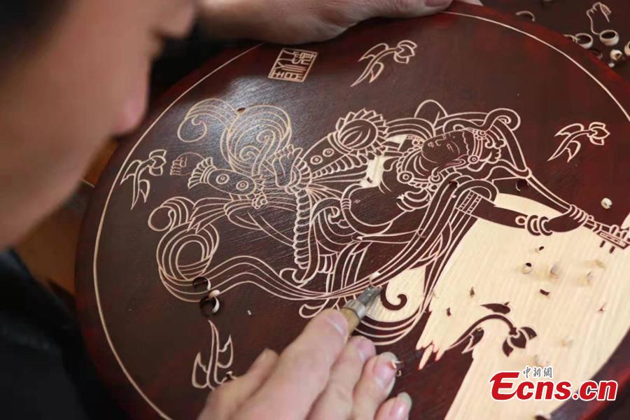 A woodcarver carves a "Flying Apsaras" figure onto a piece of round-shaped wooden board in Dunhuang, northwest China's Gansu Province, Dec. 27, 2020. (Photo/Zhang Jing)