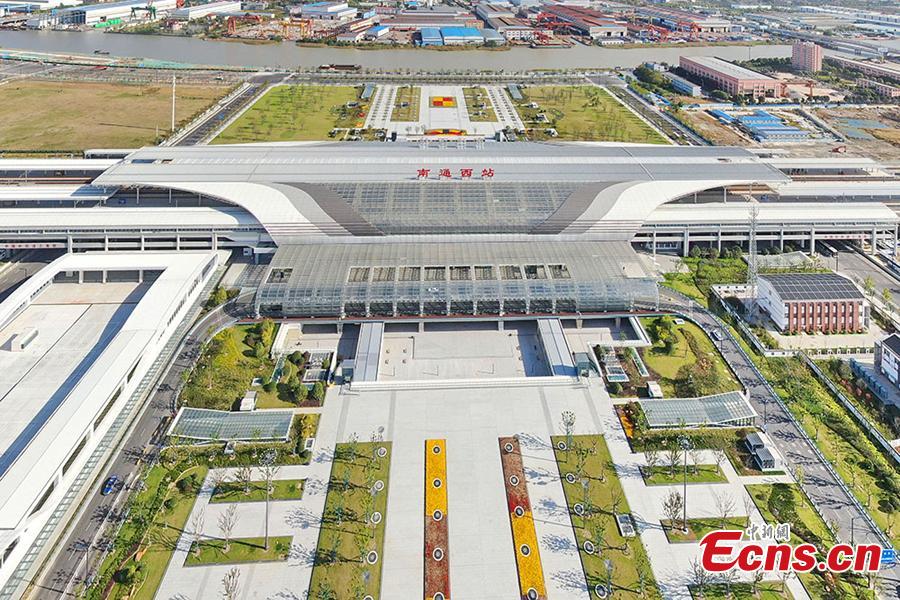 This aerial photo shows a view of Nantong West Station along the Yancheng-Nantong high speed railway which is about to open. (Photo: China News Service/Xu Congjun)