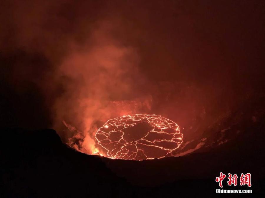Aerial photo shows Lava lake boiling within Halemaumau Crater, Kilauea Volcano, Hawaii Volcanoes National Park, Hawaii, U.S., Dec. 28, 2020. Lava continues to flow from Kilauea on the Big Island after erupting over a week ago. (Photo/IC Photo)