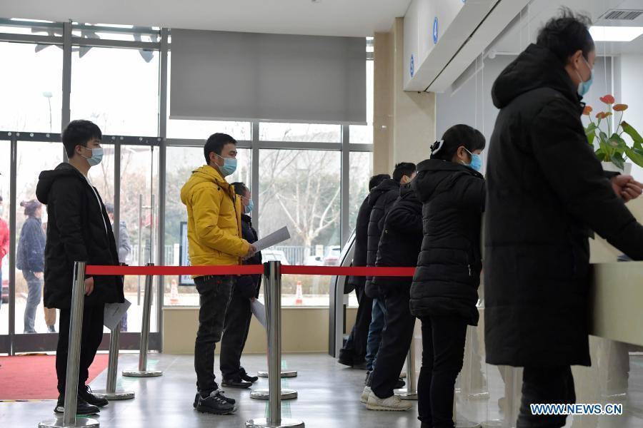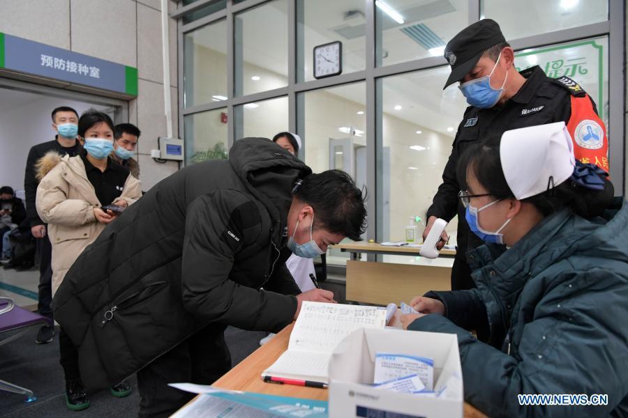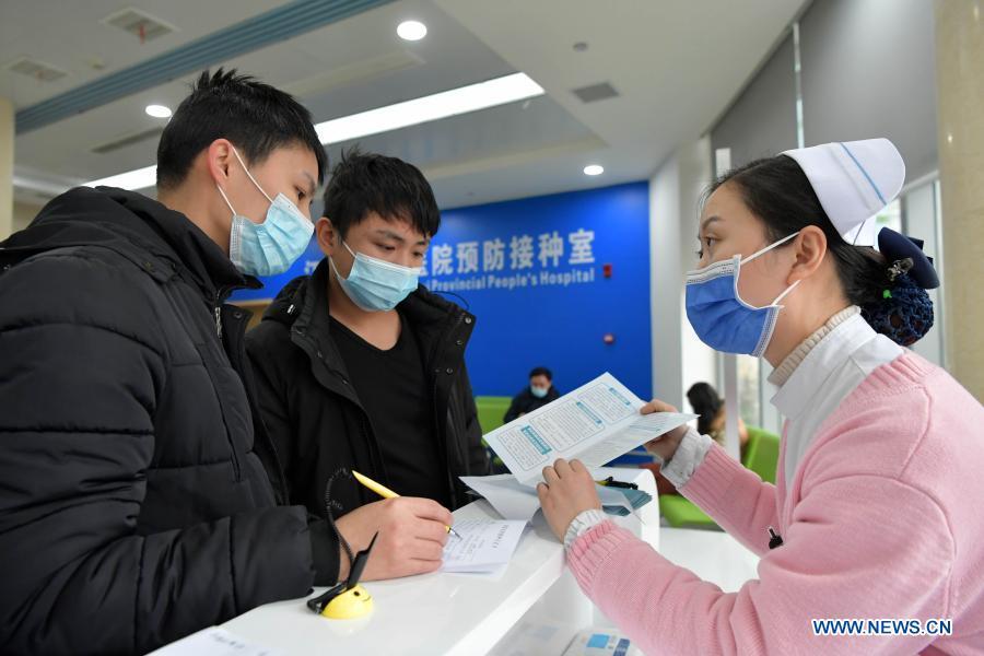 People register before their COVID-19 vaccinations at Jiangxi Provincial People's Hospital in Nanchang, capital of east China's Jiangxi Province, Jan. 4, 2021. Key groups with higher risks of infection, including frontline medical workers, customs inspectors of imported cold-chain goods and personnel working in the overseas and domestic transportation sector, began to receive their first COVID-19 vaccine doses in Jiangxi Province. (Xinhua/Peng Zhaozhi)