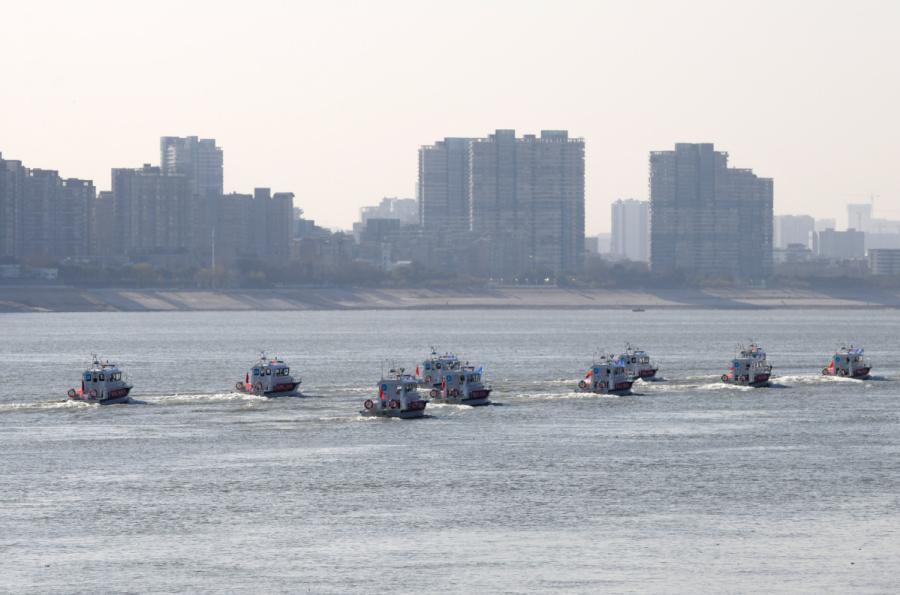 Patrol boat crews check the Yangtze River in Wuhan, Hubei province, last month after the introduction of a 10-year fishing ban on the waterway.(Photo/Xinhua)