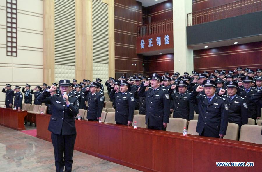 The judicial police of Inner Mongolia Higher People's Court renew their vows of joining the police in north China's Inner Mongolia Autonomous Region, Jan. 10, 2021. Activities were held to mark the first Chinese People's Police Day, which falls on Sunday. (Photo by Zhu Ruiqing/Xinhua)