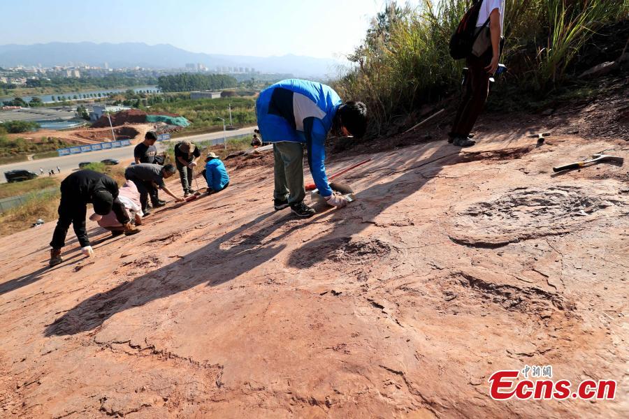 A team of Chinese paleontologists has identified more than 240 fossilized dinosaur footprints in Shanghang County, east China's Fujian on Nov. 7, 2020, scientists said at a news conference held in Fuzhou, capital of Fujian, on Tuesday. It is the first traces of dinosaur activity found in the province. Covering an area of about 1,600 square meters, the dinosaur track site is the largest and the most diverse one of such sites discovered in China dating back to the Upper Cretaceous period, according to scientists.