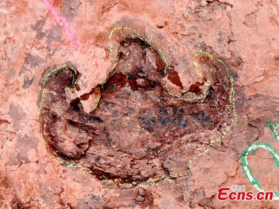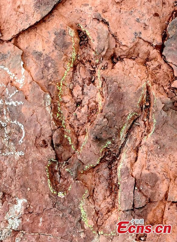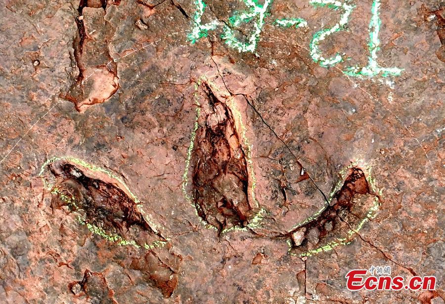 A footprints left by large bird-like Deinonychosauria was discovered in Shanghang County, east China's Fujian Province, Nov. 10, 2020. (Photo: Shanghang County, Fujian Province)