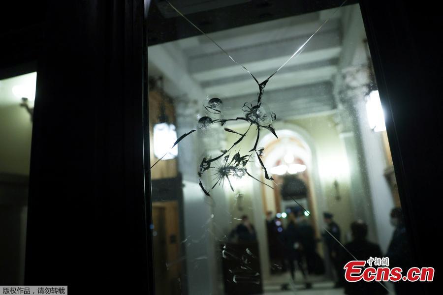 Damage to glass doors can be seen near the House floor at the Capitol in Washington, U.S., Jan. 12, 2021. (Photo/Agencies)