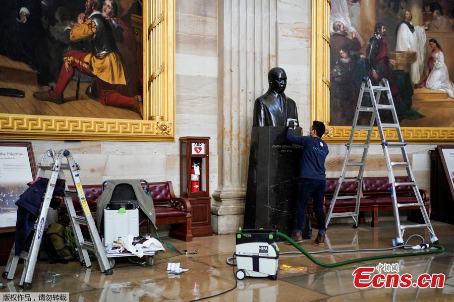 Architect of the Capitol cleans dust from the bust of Martin Luther King, Jr. in the Capitol Rotunda in Washington, U.S., Jan. 12, 2021. (Photo/Agencies)